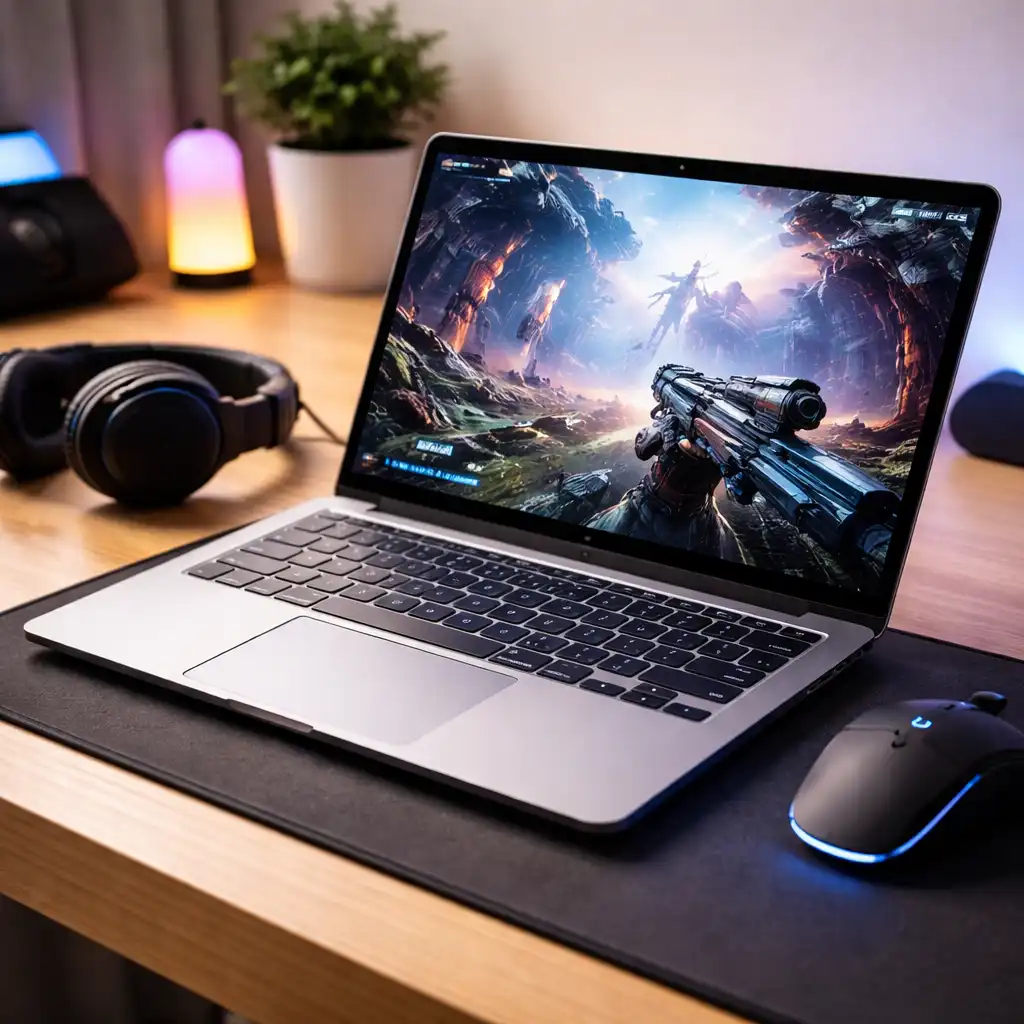 Modern slim laptop showing a colorful action game on screen with a wireless mouse and headphones on a clean desk setup.